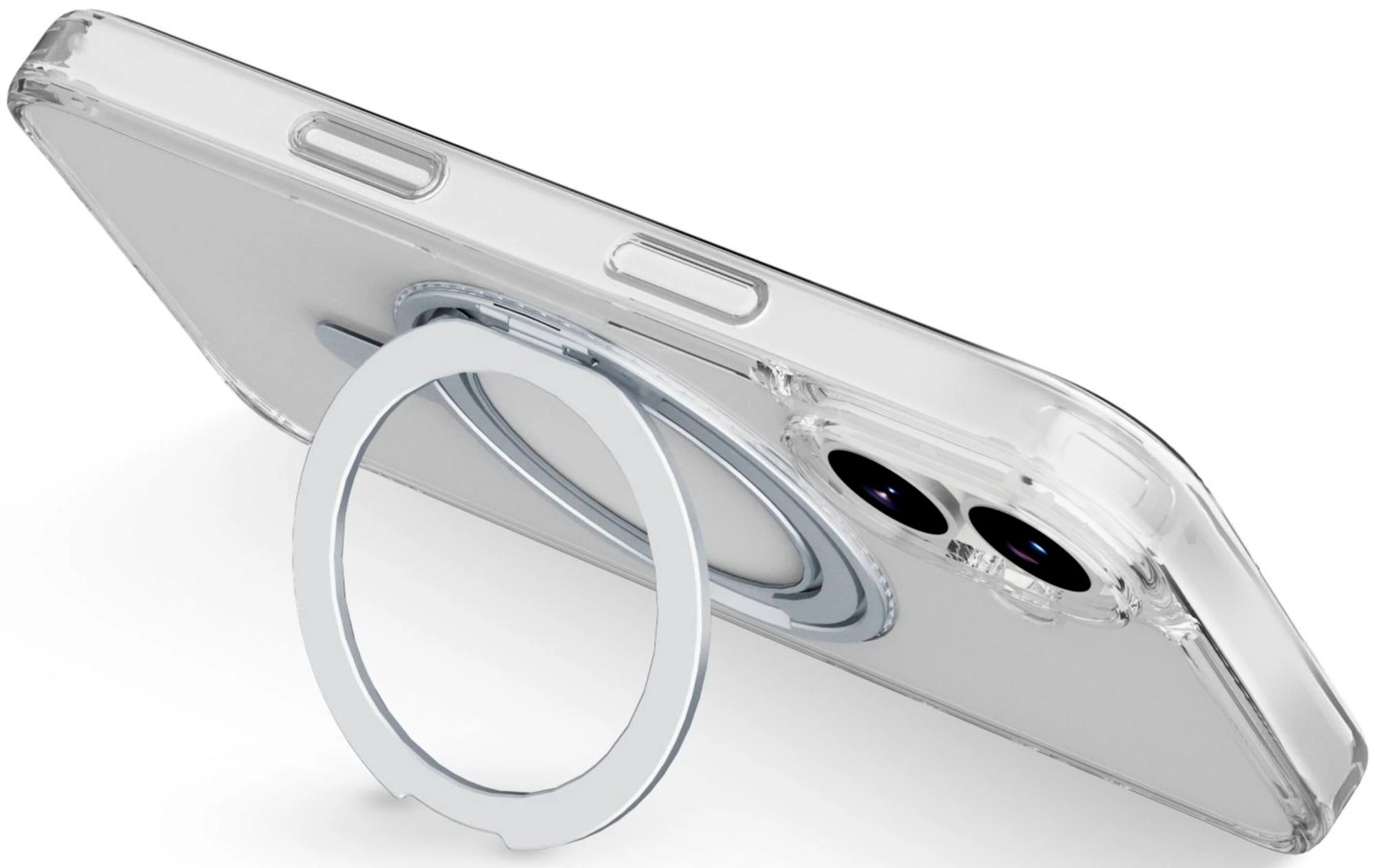 SPIN MAG ist die transparente Hülle mit drehbarem Ständer, die mit dem MagSafe-System kompatibel ist. Es zeichnet sich durch einen um 360 Grad drehbaren Ring aus, der es dem Gehäuse ermöglicht, verschiedene Funktionen wie Stand- und Halterungsfunktionen zu übernehmen. Der Ring ist integriert und wird bei Nichtgebrauch zu einem integralen Bestandteil des Gehäuses, sodass es mit MagSafe-Zubehör kompatibel ist. Die erhöhten Kanten rund um das Display und die Kamerabereiche schützen das Telefon vor versehentlichen Stößen und Stürzen.
