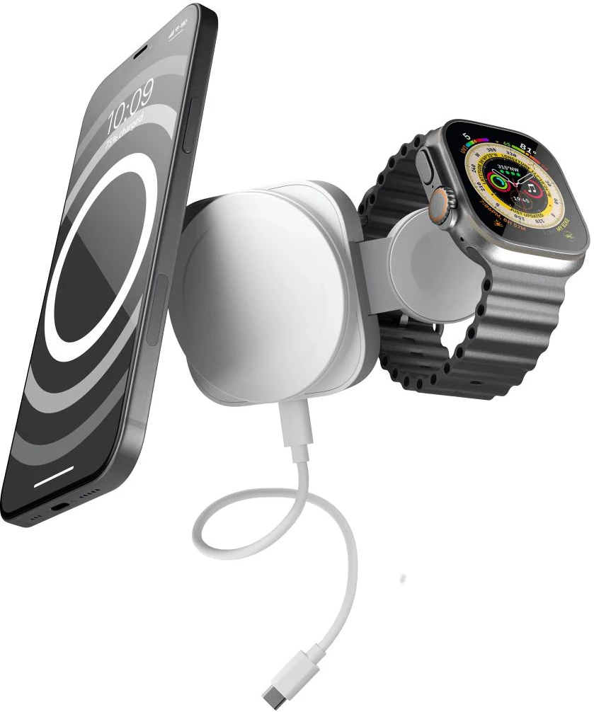Das 2-in-1-Reiseladegerät MagSafe + Watch ist vollständig kompatibel mit jeder Apple Watch, einschließlich der Apple Watch Ultra. Beim Öffnen des Ständers wird ein iPhone 12 und höher aufgeladen und liegt dem Benutzer in horizontaler Position gegenüber. Ein Reiseetui ist im Lieferumfang enthalten und verstaut das 2-in-1 MagSafe + Watch-Reiseladegerät sowie das USB-C-zu-USB-C-Ladekabel sicher. Dieses einzigartige 2-in-1-Ladegerät inklusive Reiseetui sorgt dafür, dass sich Kabel und Ladegeräte nicht in einer Tasche oder einem Koffer verheddern. Seelenfrieden mit der Kraft in Ihrer Handfläche.